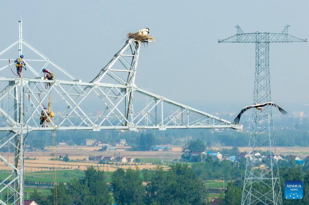 Workers of State Grid Anhui Electric Power Co., Ltd. install a camera near the nest of oriental white storks in Huoqiu County, east China's Anhui Province, May 20, 2025. In early May this year, workers discovered a nest of oriental white stork, a migratory bird under first-class state protection, on the newly-built transmission tower. The State Grid Anhui Electric Power Co., Ltd. has installed high-definition cameras near the nest, assigned designated staff to track and protect the oriental white storks, and postponed the construction progress according to the breeding timeline of the storks. (Xinhua/Zhou Mu)