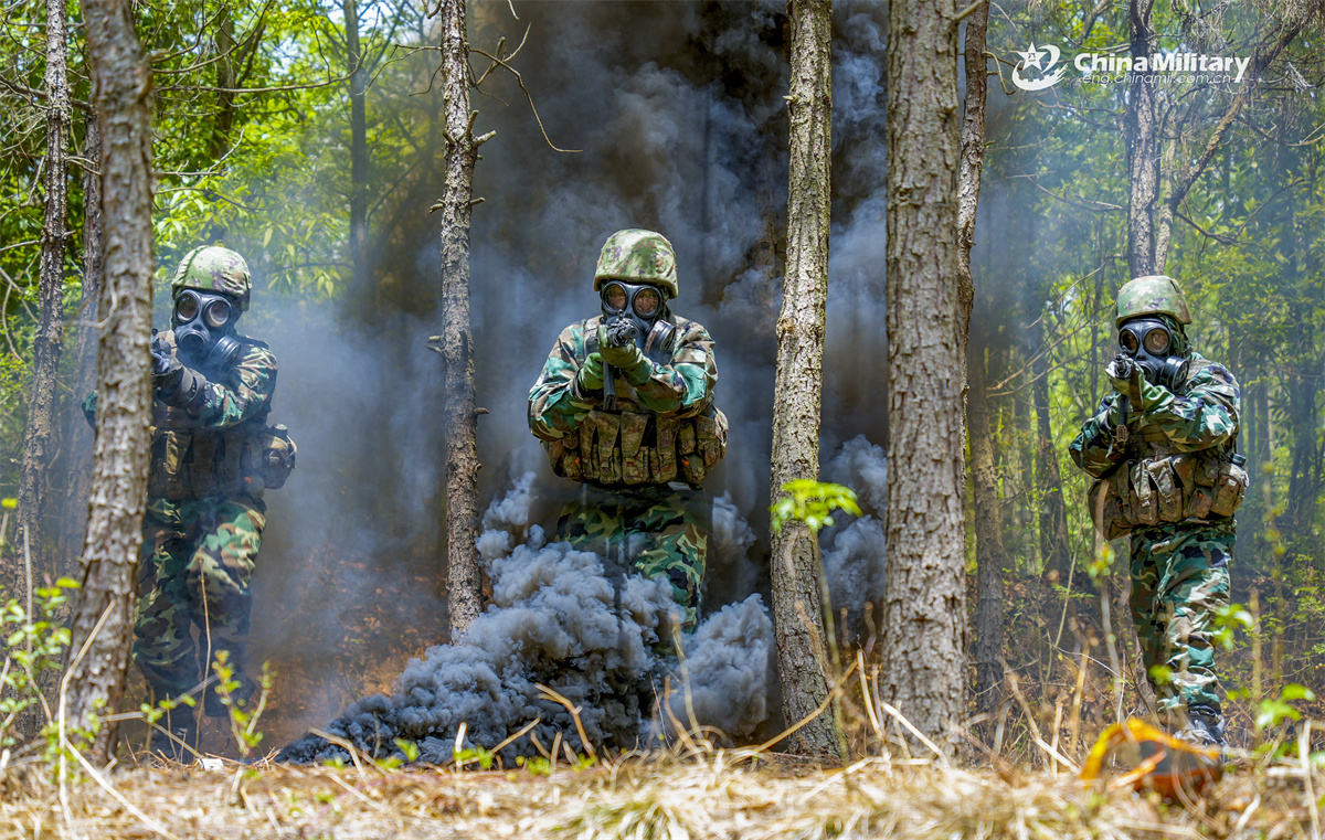 Soldiers assigned to a brigade under the Chinese PLA 71st Group Army pass through the contaminated area in combat formation during an emergency chemical defense training exercise on May 14, 2025. (eng.chinamil.com.cn/Photo by Lin Weihong and Jiang Yucheng)