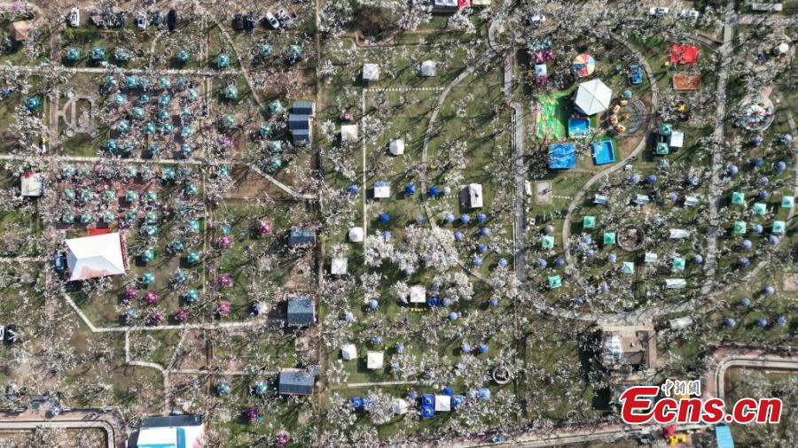File photo taken on April 10, 2024 shows visitors take photos of blooming pear flowers at the Gaolan Shichuan Ancient Pear Orchard System in Lanzhou City, northwest China's Gansu Province. (Photo/China News Service)