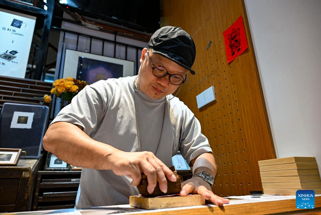 The owner of a movable-type printing shop in the Yongqing Block makes a movable-type printing decoration in Guangzhou, south China's Guangdong Province, May 13, 2025. (Xinhua/Chen Shuo)