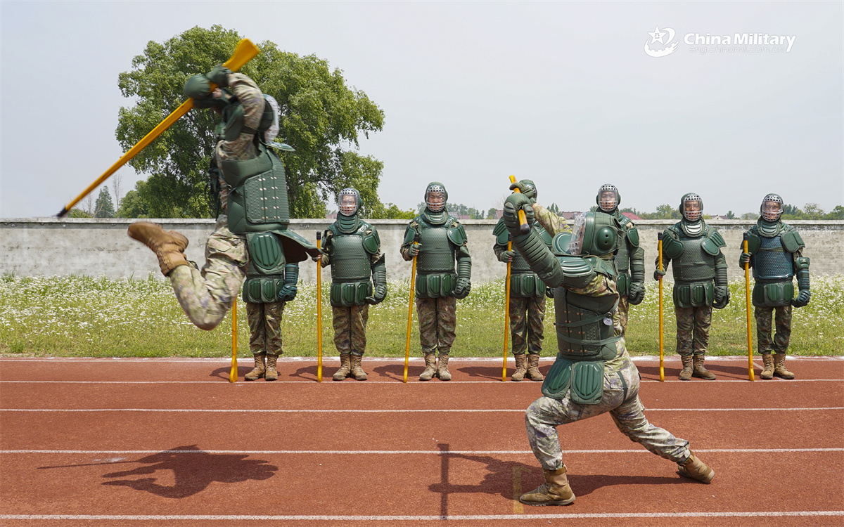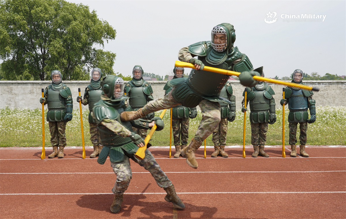 Soldiers assigned to an air force unit under the Chinese PLA Eastern Theater Command practice bayonet fighting skills in pairs on May 8 to hone their vigilance, defense, and emergency response capabilities. (eng.chinamil.com.cn/Zhu Yunlong)