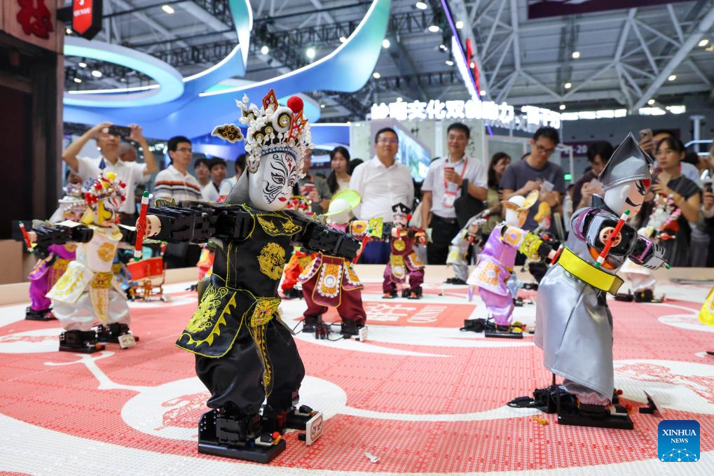 Visitors watch robots performing the local traditional Yingge dance at the exhibition area of Shantou in south China's Guangdong Province during the 21st China (Shenzhen) International Cultural Industries Fair in Shenzhen of Guangdong, May 22, 2025. The fair lasts from May 22 to 26. (Xinhua/Liang Xu)