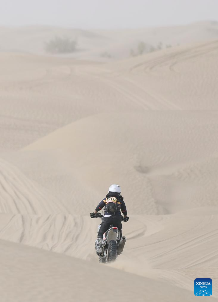 Rider Sun Yifei competes during stage 2 of the 2025 Taklimakan Rally in Alaer, northwest China's Xinjiang Uygur Autonomous Region, May 22, 2025. (Xinhua/Hu Xingyu)