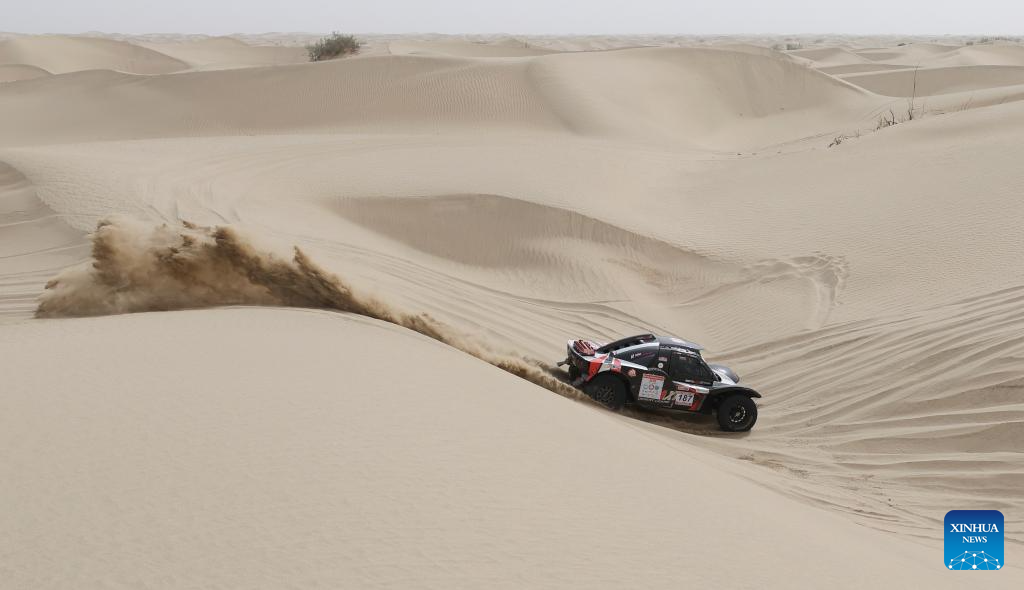 Driver Zhang Ming and co-driver Qin Xu compete during stage 2 of the 2025 Taklimakan Rally in Alaer, northwest China's Xinjiang Uygur Autonomous Region, May 22, 2025. (Xinhua/Hu Huhu)