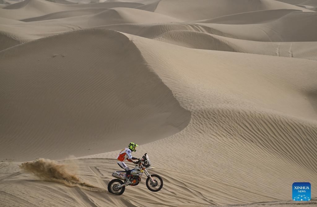 Rider Aizihaier Jiapaer competes during stage 2 of the 2025 Taklimakan Rally in Alaer, northwest China's Xinjiang Uygur Autonomous Region, May 22, 2025. (Xinhua/Hu Huhu)