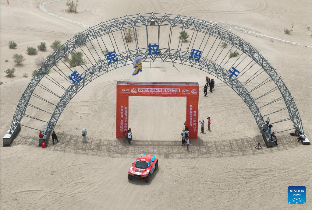 A drone photo shows driver Sun Xiangyan and co-driver Ma Xin compete during stage 2 of the 2025 Taklimakan Rally in Alaer, northwest China's Xinjiang Uygur Autonomous Region, May 22, 2025. (Xinhua/Hu Xingyu)