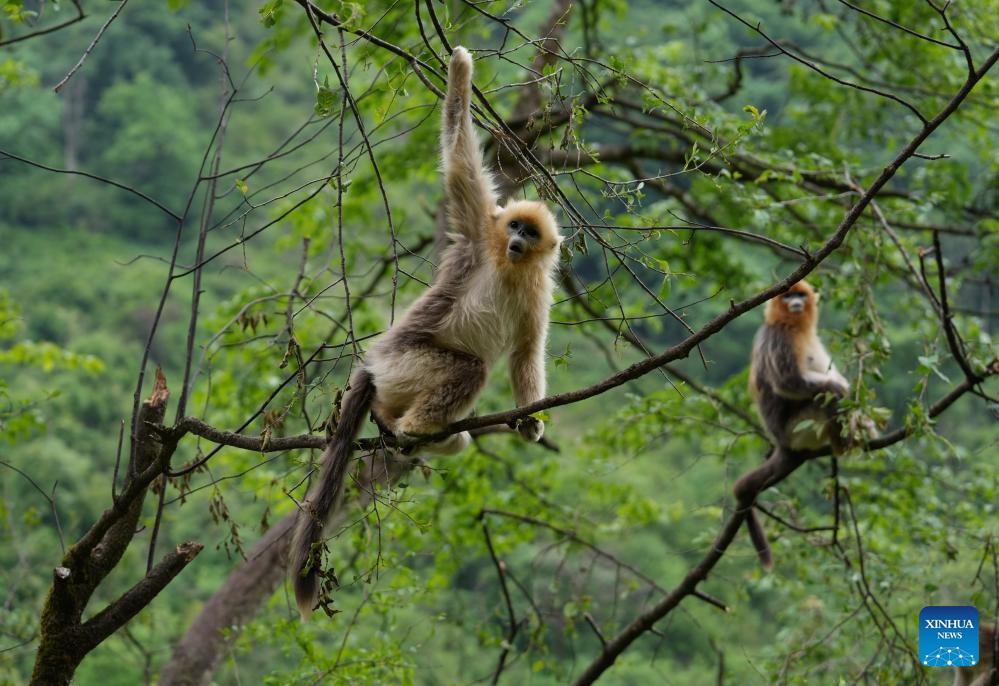 Golden snub-nosed monkeys are pictured in the Pingwu Sichuan golden snub-nosed monkey popular science education base in Pingwu County, Mianyang City of southwest China's Sichuan Province, May 21, 2025. Located within the Xiaohegou Nature Reserve, a provincial-level nature reserve in Sichuan Province, Pingwu Sichuan golden snub-nosed monkey popular science education base is home to over 40 Sichuan golden snub-nosed monkeys. According to the latest monitoring data of 2024, Xiaohegou Nature Reserve is the habitat of about 1,000 Sichuan golden snub-nosed monkeys. (Xinhua/Jiang Hongjing)