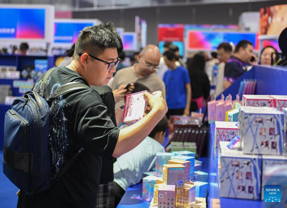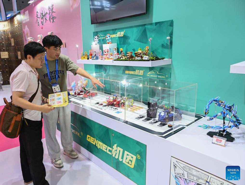 A visitor looks at an electronic sports-themed blind box at the 21st China (Shenzhen) International Cultural Industries Fair in Shenzhen, south China's Guangdong Province, May 24, 2025. The 21st China (Shenzhen) International Cultural Industries Fair opened Thursday in the southern Chinese metropolis of Shenzhen, offering an artificial intelligence (AI) exhibition area for the first time.