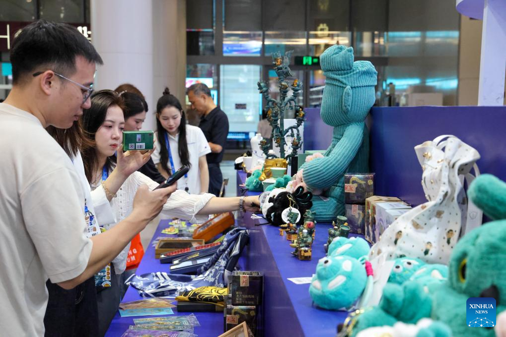 Visitors purchase Sanxingdui-themed products at the 21st China (Shenzhen) International Cultural Industries Fair in Shenzhen, south China's Guangdong Province, May 23, 2025. The 21st China (Shenzhen) International Cultural Industries Fair opened Thursday in the southern Chinese metropolis of Shenzhen, offering an artificial intelligence (AI) exhibition area for the first time.