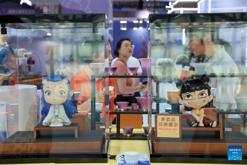 This photo taken on May 22, 2025 shows toys themed on the hit animated film "Ne Zha 2" at the 21st China (Shenzhen) International Cultural Industries Fair in Shenzhen, south China's Guangdong Province. The 21st China (Shenzhen) International Cultural Industries Fair opened Thursday in the southern Chinese metropolis of Shenzhen, offering an artificial intelligence (AI) exhibition area for the first time.