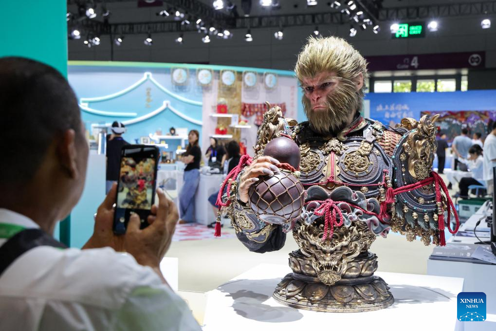 A visitor takes photos of a "Black Myth: Wukong" bust at the 21st China (Shenzhen) International Cultural Industries Fair in Shenzhen, south China's Guangdong Province, May 23, 2025. The 21st China (Shenzhen) International Cultural Industries Fair opened Thursday in the southern Chinese metropolis of Shenzhen, offering an artificial intelligence (AI) exhibition area for the first time.