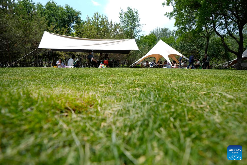 People enjoy camping at Haibao park in Yinchuan, northwest China's Ningxia Hui Autonomous Region, May 25, 2025. (Xinhua/Wang Peng)