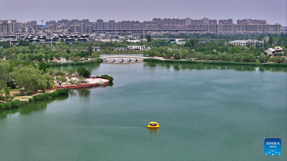 An aerial drone photo taken on May 25, 2025 shows people rowing a boat at Haibao park in Yinchuan, northwest China's Ningxia Hui Autonomous Region. (Xinhua/Wang Peng)