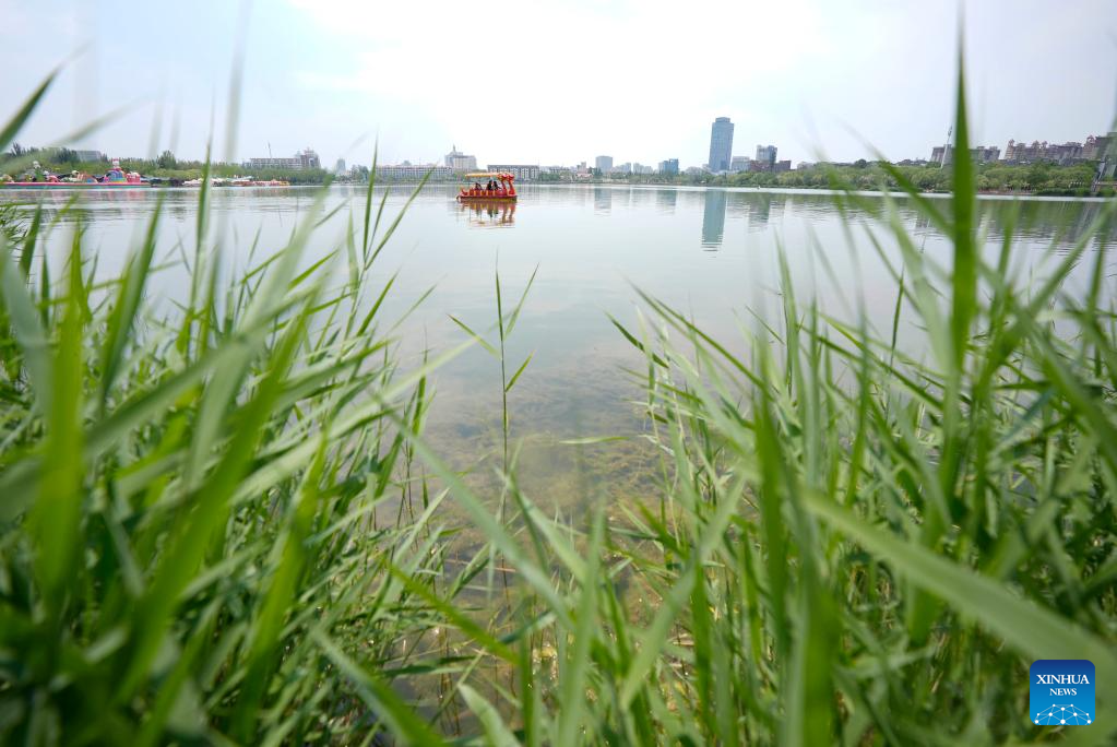 People row a boat at Haibao park in Yinchuan, northwest China's Ningxia Hui Autonomous Region, May 25, 2025. (Xinhua/Wang Peng)