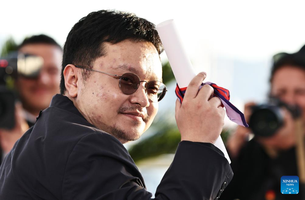 Chinese director Bi Gan arrives for a photocall during the closing ceremony of the 78th Cannes Film Festival in Cannes, France, May 24, 2025. Chinese director Bi Gan won on Saturday the Special Award at the 78th Cannes Film Festival for his epic fiction feature Resurrection, known in Chinese as Kuang Ye Shi Dai. Festival organizers introduced Resurrection as a work that showcases the continued evolution of Bi's creativity, while staying true to the sensory and poetic qualities that define his unique cinematic style. (Xinhua/Gao Jing)