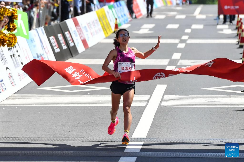 Huang Xuemei of China crosses the finish line to win the women's marathon event during the 2025 Hongqi Changchun Marathon in Changchun, northeast China's Jilin Province, on May 25, 2025. (Xinhua/Zhang Nan)
