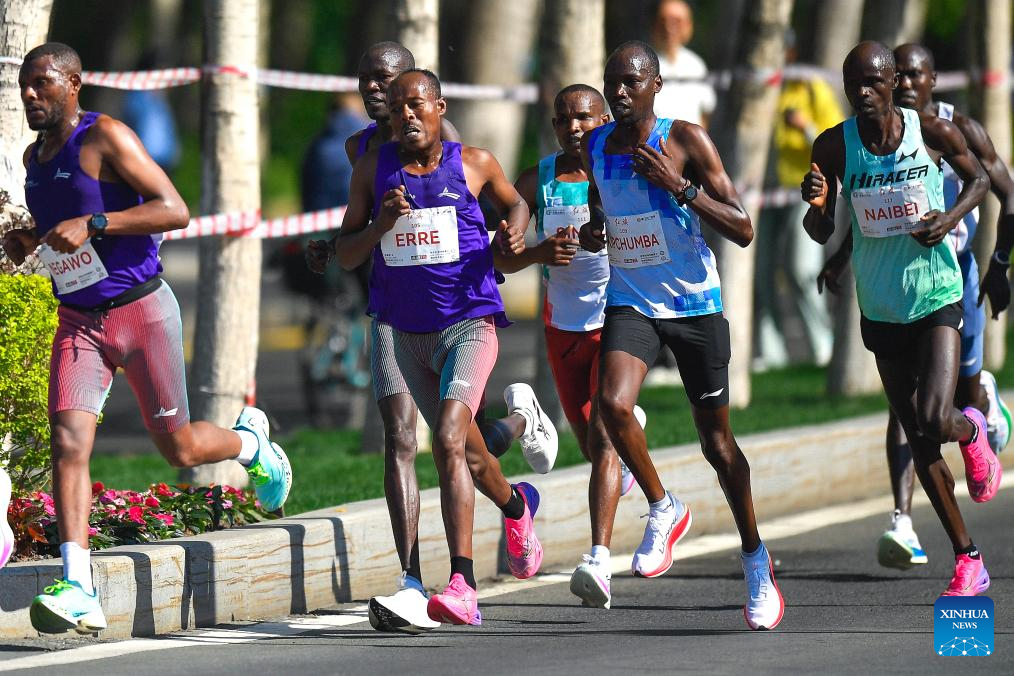 Men's marathon winner Seboka Negusse Erre (2nd L) of Ethiopia competes during the 2025 Hongqi Changchun Marathon in Changchun, northeast China's Jilin Province, on May 25, 2025. (Xinhua/Xu Chang)