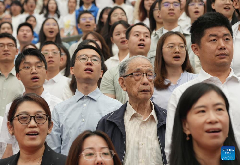 Alumni, students and faculty members sing their alma mater during the 120th anniversary ceremony of Fudan University in Shanghai, east China, May 27, 2025. Founded in 1905, Fudan University is a comprehensive, research-oriented university based in Shanghai. (Xinhua/Liu Ying)