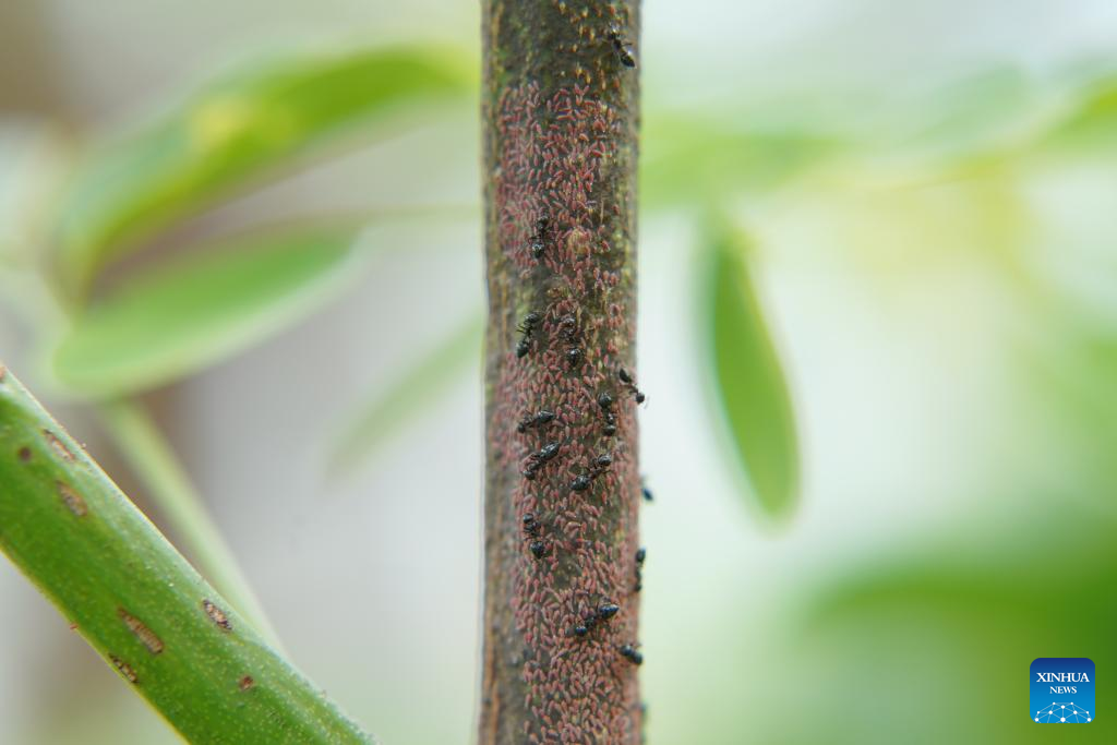 This photo taken on May 14, 2025 shows ants and shellac bugs in Yayi Town, Mojiang Hani Autonomous County of Pu'er City, southwest China's Yunnan Province. (Xinhua/Gao Yongwei)