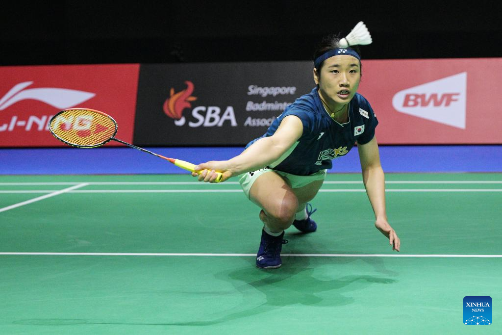 An Se-young of South Korea hits a return during the women's singles quarterfinal against Chen Yufei of China at the Singapore Badminton Open 2025 in Singapore, May 30, 2025. (Photo by Then Chih Wey/Xinhua)