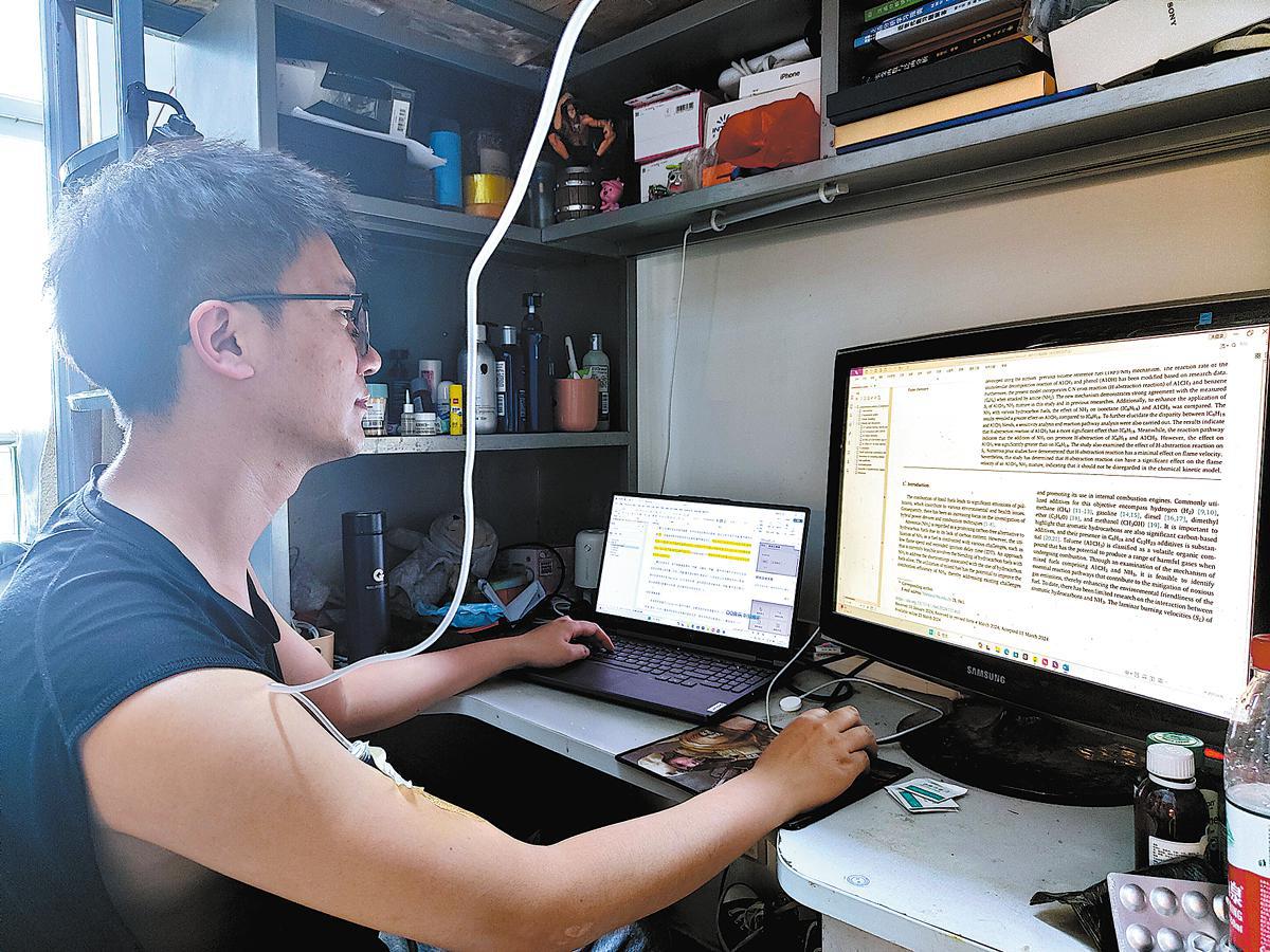 Liu Zechang works on his research paper in his dormitory in Beijing. (Photo/China Daily)