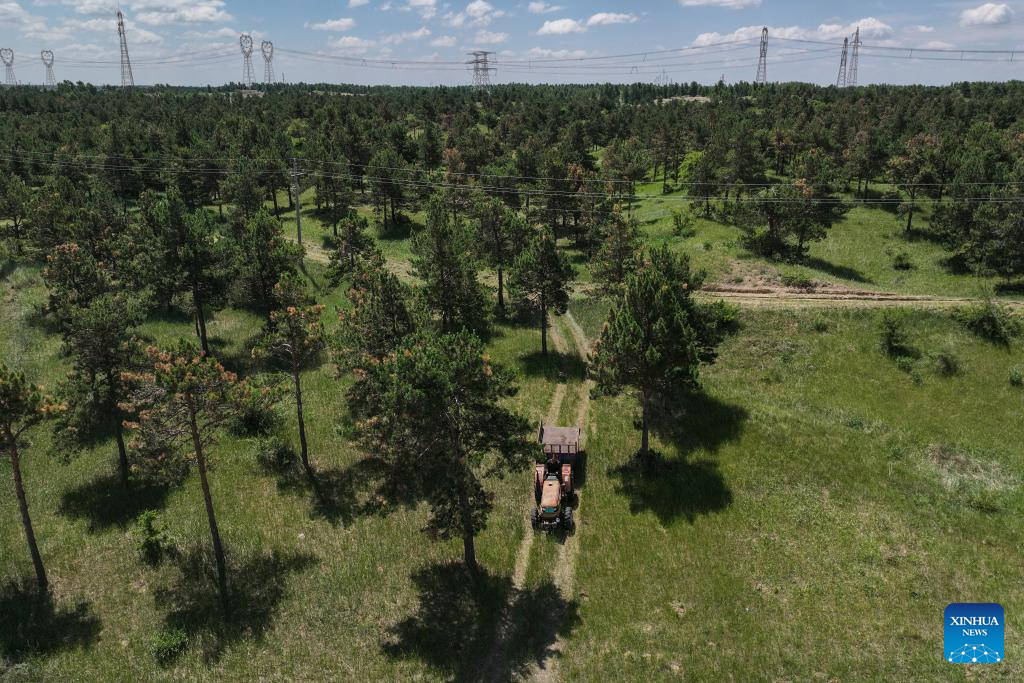 This aerial drone photo taken on June 4, 2025 shows Li Dongkui driving a tractor to a forestry farm in Zhanggutai Town of Zhangwu County, Fuxin City of northeast China's Liaoning Province. Li Mingming, secretary of the Communist Party of China branch of Arxiang Village of Zhangwu County, Fuxin City of northeast China's Liaoning Province, is a native of Arxiang. Her father Li Dongkui is a locally renowned forest ranger. (Xinhua/Pan Yulong)
