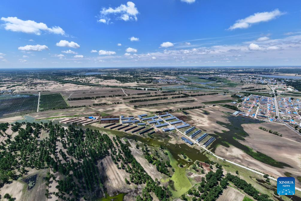 This aerial drone photo taken on June 4, 2025 shows an industrial park (front, blue greenhouses area) in Arxiang Village of Zhangwu County, Fuxin City of northeast China's Liaoning Province. Li Mingming, secretary of the Communist Party of China branch of Arxiang Village of Zhangwu County, Fuxin City of northeast China's Liaoning Province, is a native of Arxiang. Her father Li Dongkui is a locally renowned forest ranger. (Xinhua/Pan Yulong)
