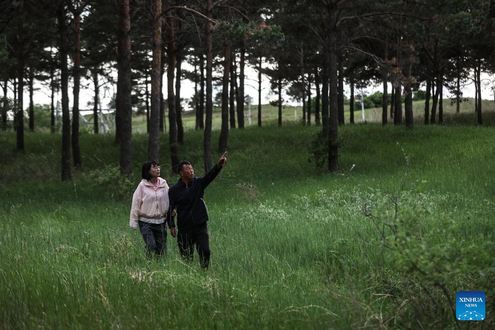 Li Mingming and her father Li Dongkui take a walk at a forestry farm in Zhanggutai Town of Zhangwu County, Fuxin City of northeast China's Liaoning Province, June 3, 2025. Li Mingming, secretary of the Communist Party of China branch of Arxiang Village of Zhangwu County, Fuxin City of northeast China's Liaoning Province, is a native of Arxiang. Her father Li Dongkui is a locally renowned forest ranger. (Xinhua/Pan Yulong)