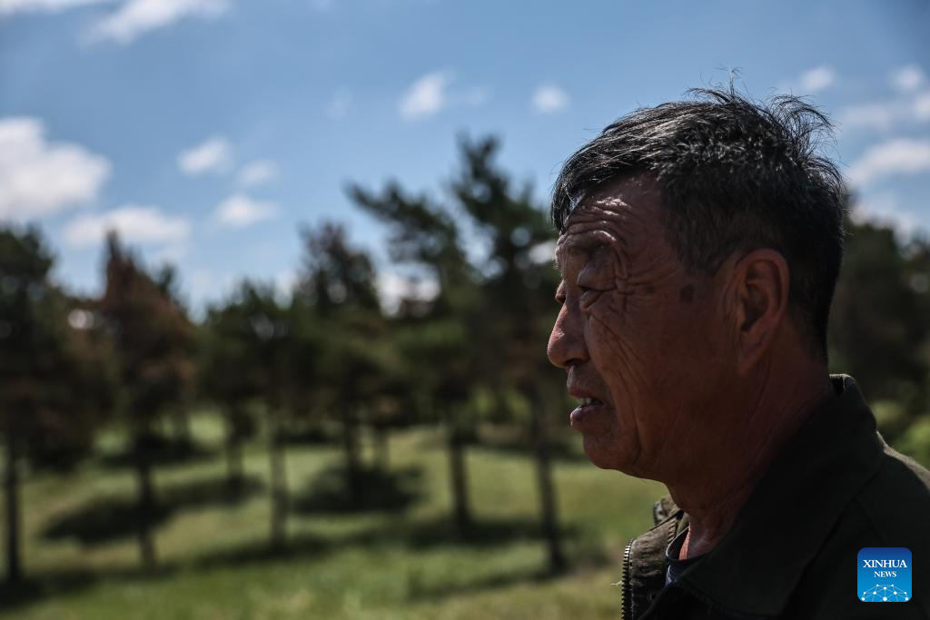 Li Dongkui checks the condition of trees at a forestry farm in Zhanggutai Town of Zhangwu County, Fuxin City of northeast China's Liaoning Province, June 4, 2025. Li Mingming, secretary of the Communist Party of China branch of Arxiang Village of Zhangwu County, Fuxin City of northeast China's Liaoning Province, is a native of Arxiang. Her father Li Dongkui is a locally renowned forest ranger. (Xinhua/Pan Yulong)