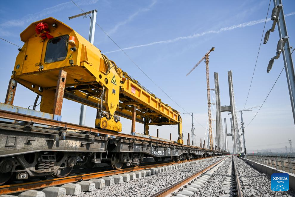 A steel rail laying machine operates at the construction site of the Wuhai Yellow River grand bridge in north China's Inner Mongolia Autonomous Region, June 6, 2025.