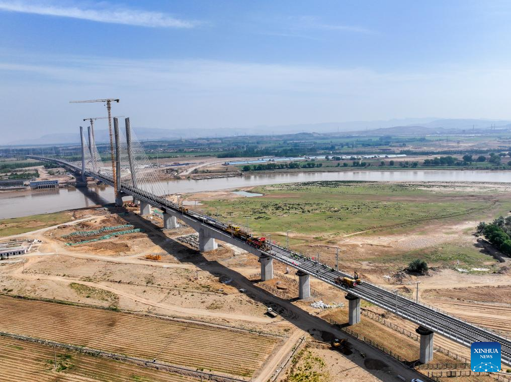 Workers lay steel rails at the construction site of the Wuhai Yellow River grand bridge in north China's Inner Mongolia Autonomous Region, June 6, 2025.