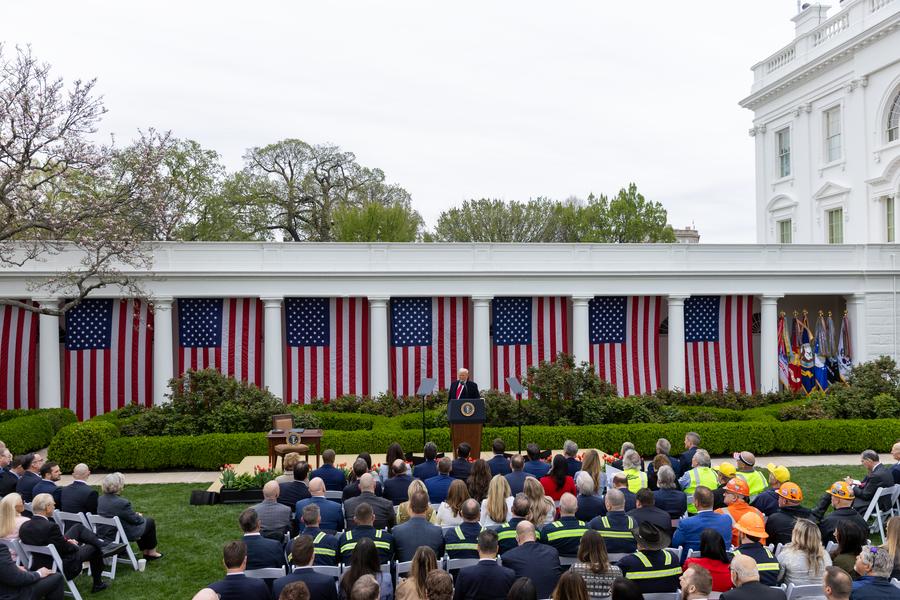 U.S. President Donald Trump (Rear) delivers remarks on "reciprocal tariffs" at the Rose Garden of the White House in Washington, D.C., the United States, on April 2, 2025. (Xinhua/Hu Yousong)