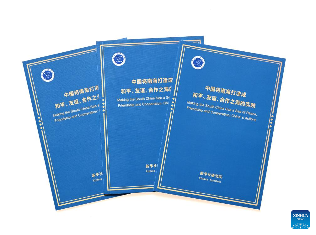 This photo shows the report, titled "Making the South China Sea a Sea of Peace, Friendship and Cooperation: China's Actions" and published in both Chinese and English, released by Xinhua Institute, a think tank affiliated with Xinhua News Agency, on World Oceans Day, June 8, 2025. (Xinhua/Li He)