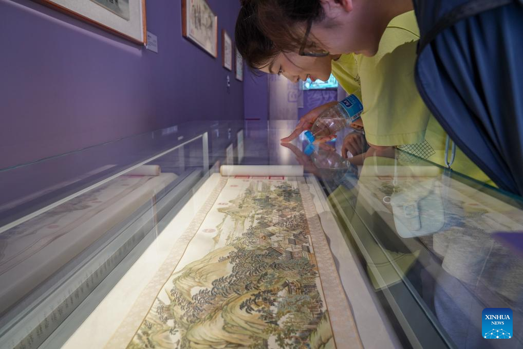 Visitors watch a hair embroidery artwork at a hair embroidery exhibition hall of a scenic spot in Dongtai City, Yancheng of east China's Jiangsu Province, June 6, 2025. (Xinhua/Xu Suhui)