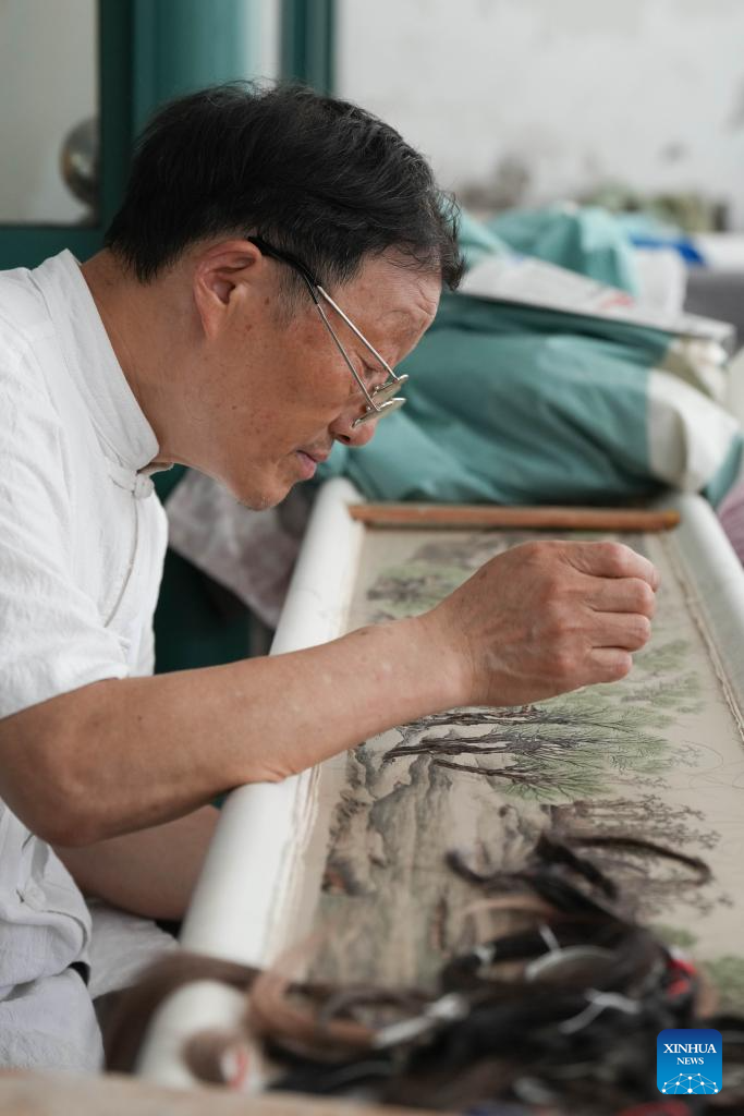Chen Boyu works on a hair embroidery artwork at the Jiali hair embroidery factory in Dongtai City, Yancheng of east China's Jiangsu Province, June 6, 2025. (Xinhua/Xue Yuge)