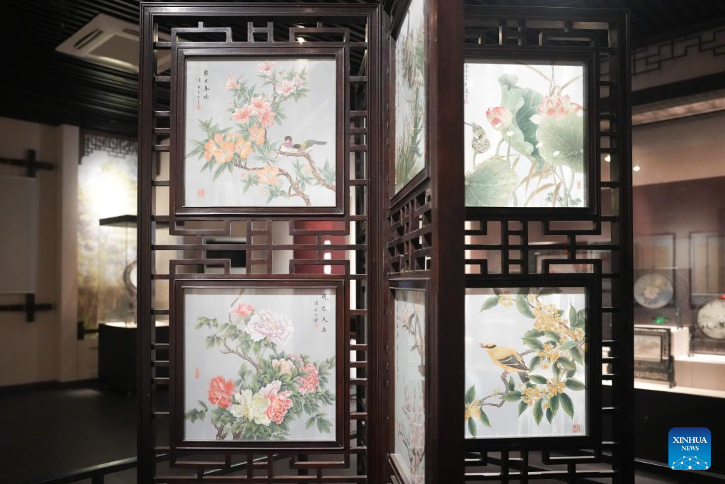 Hair embroidery artworks are displayed at the Dongtai Museum in Dongtai City, Yancheng of east China's Jiangsu Province, June 6, 2025. (Xinhua/Xue Yuge)