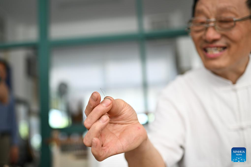 Chen Boyu shows a special needle used for hair embroidery at the Jiali hair embroidery factory in Dongtai City, Yancheng of east China's Jiangsu Province, June 6, 2025. (Xinhua/Xin Yuewei)