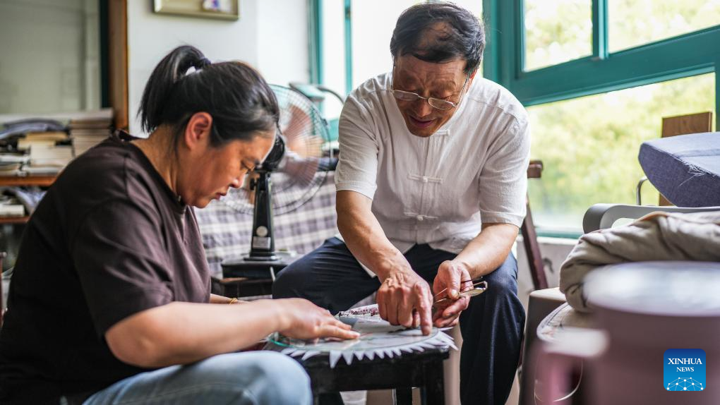 Chen Boyu guides an apprentice to mount a double-faced hair embroidery artwork at the Jiali hair embroidery factory in Dongtai City, Yancheng of east China's Jiangsu Province, June 6, 2025. (Xinhua/Tao Liang)