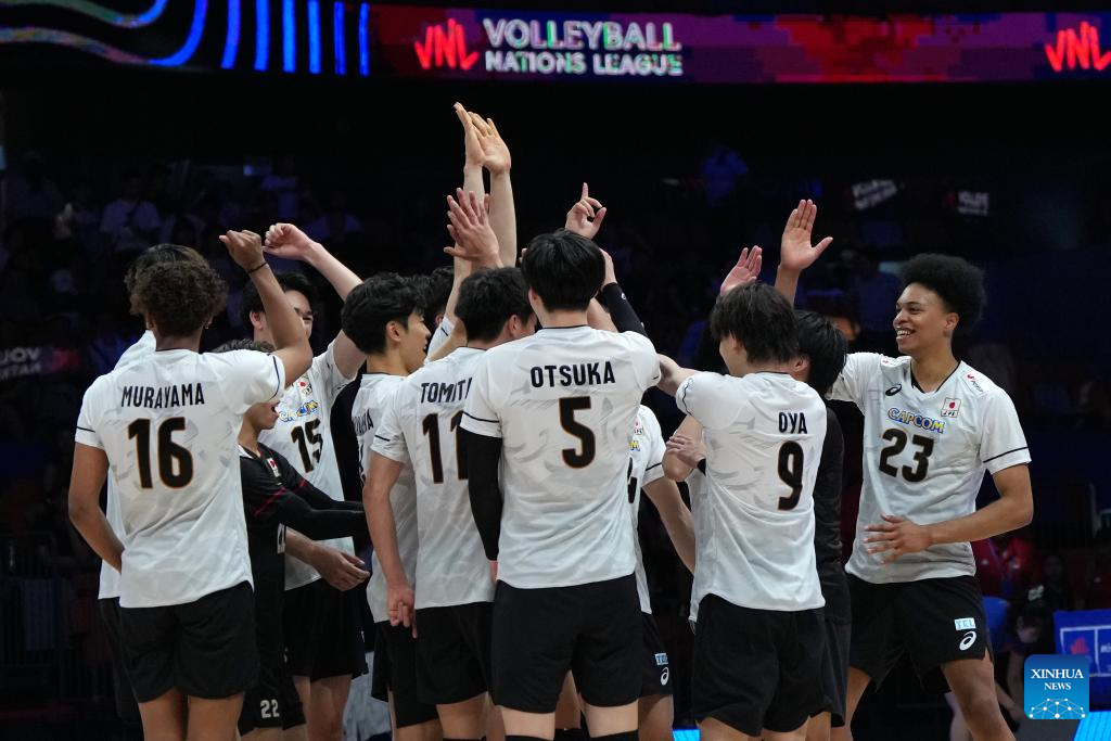 Players of Japan celebrate victory during the Pool 3 match between China and Japan at the Men's Volleyball Nations League (VNL) 2025 in Xi'an, northwest China's Shaanxi Province, June 11, 2025. (Xinhua/Li Yibo)