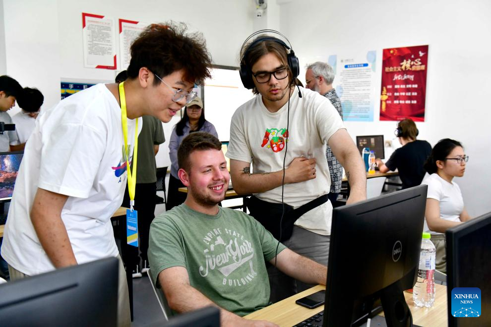 Students from Leeds Beckett University learn video editing skills at Rizhao Polytechnic in Rizhao City, east China's Shandong Province, June 11, 2025. Faculties and students from the Leeds Beckett University of the UK and the Rizhao Polytechnic in Shandong held an exchange camp in Rizhao, where the attendees shot video clips and experienced traditional Chinese culture such as martial arts and tie-dyeing. The two institutions are now jointly hosting a professional training program on digital media art designing. (Xinhua/Guo Xulei)