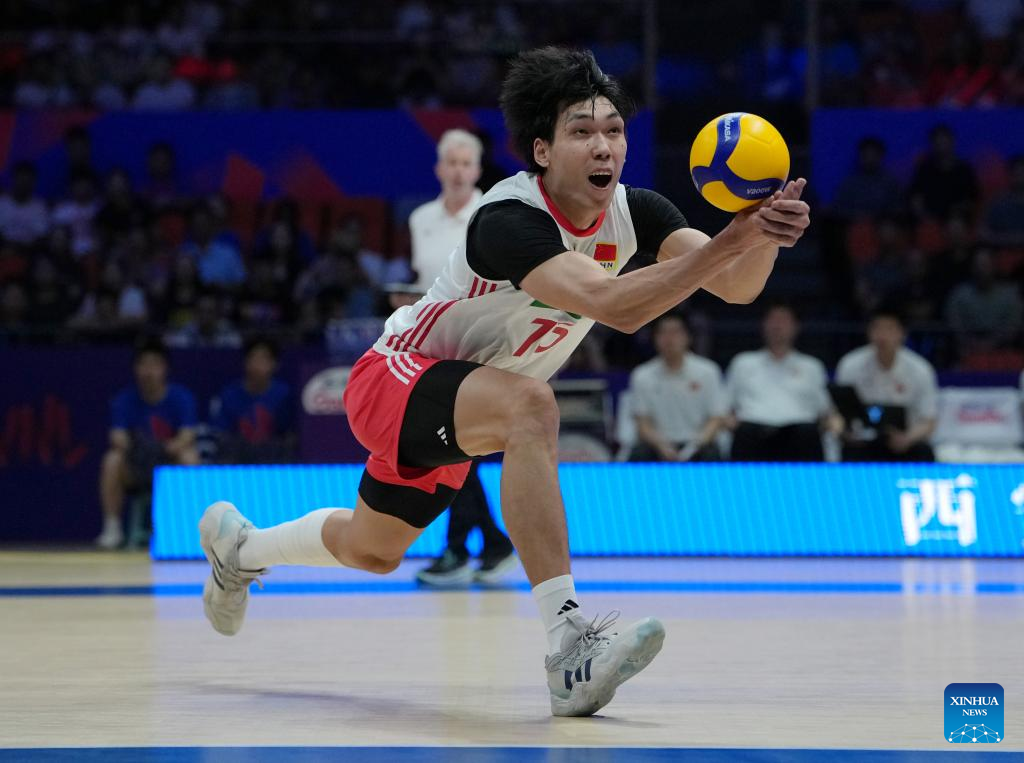 Peng Shikun of China saves the ball during the Pool 3 match between China and Serbia at the Men's Volleyball Nations League (VNL) 2025 in Xi'an, northwest China's Shaanxi Province, June 12, 2025. (Xinhua/Li Yibo)