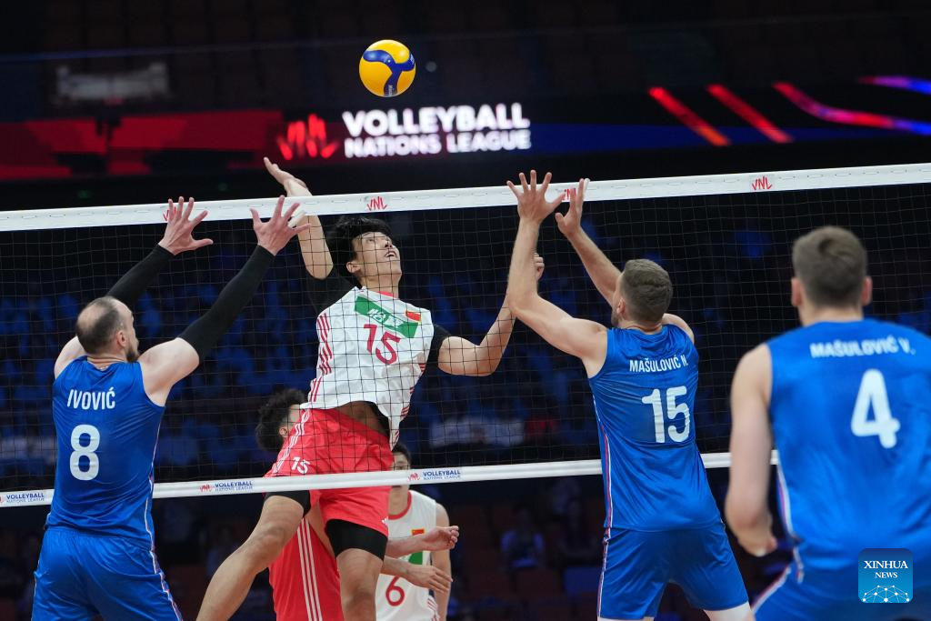 XI'AN, June 12 (Xinhua) -- World 24th-ranked China celebrated its head coach Vital Heynen's 56th birthday by breaking the curse to defeat Serbia in straight sets at the Volleyball Nations League (VNL) Xi'an leg on Thursday.