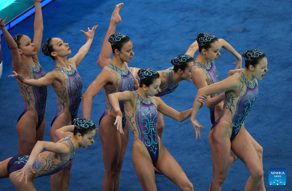 Team China perform during the team free event at the World Aquatics Artistic Swimming World Cup 2025-Super Final in Xi'an, northwest China's Shaanxi Province,June 14, 2025. (Xinhua/Li Yibo)