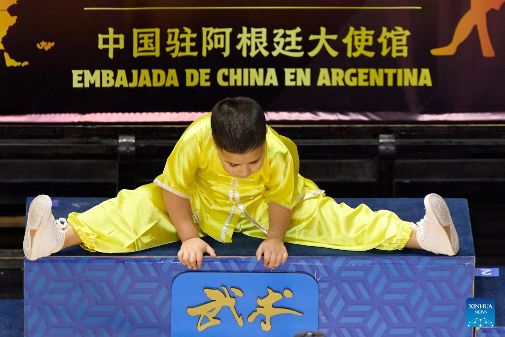 A young athlete warms up during the National Wushu Championships of Argentina in Buenos Aires, Argentina, on June 15, 2025. (Xinhua/Meng Dingbo)