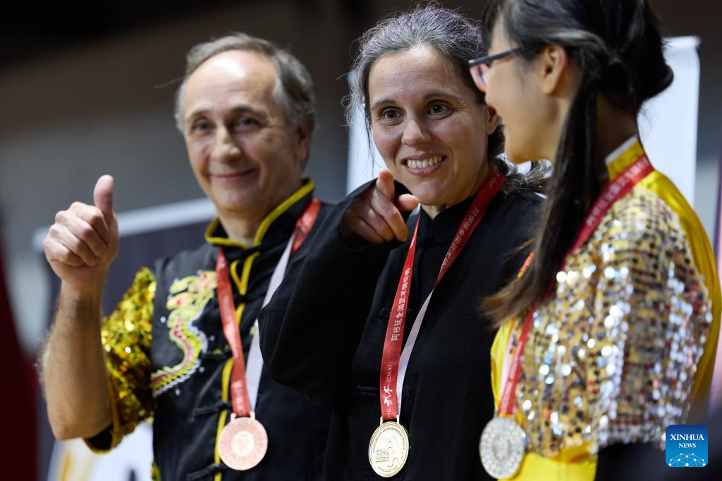 Athletes receive medals during the National Wushu Championships of Argentina in Buenos Aires, Argentina, on June 15, 2025. (Xinhua/Meng Dingbo)