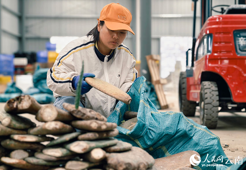 | A villager packs dried cactus pads into a bag in Zhuangzitian village group, Wenshan city, southwest China's Yunnan Province. (People's Daily Online/Yin Xin) |