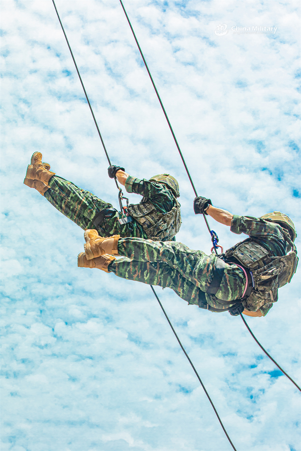 Soldiers assigned to a mobile detachment of the Chinese People's Armed Police (PAP) Guangxi Corps conduct fast-rope training during a multi-subject physical exercise on June 10, 2025. (eng.chinamil.com.cn/Photo by Liu Ming)