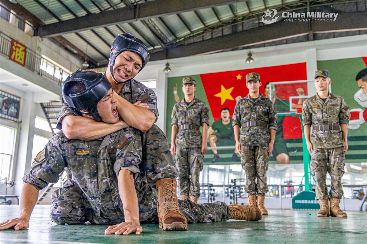 Soldiers assigned to a mobile detachment of the Chinese People's Armed Police (PAP) Guangxi Corps conduct combatives training during a multi-subject physical exercise on June 10, 2025. (eng.chinamil.com.cn/Photo by Liu Ming)