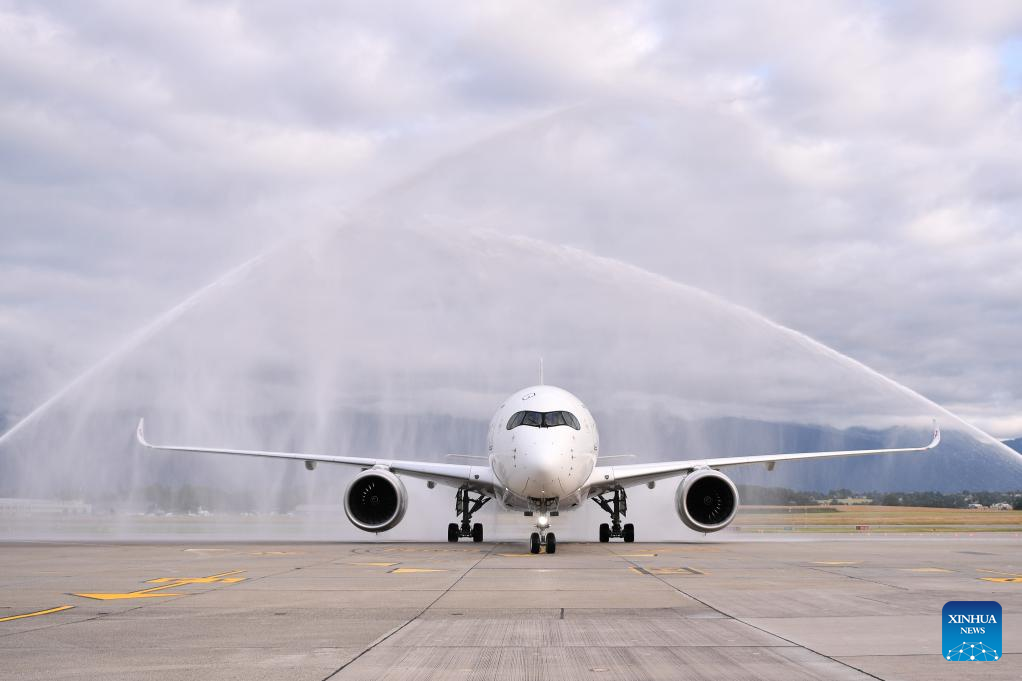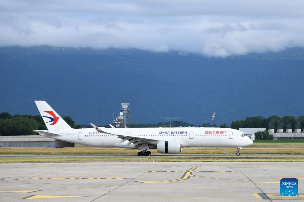 China Eastern Airlines' inaugural direct flight linking Shanghai with Geneva lands in Geneva, Switzerland, June 16, 2025. (Xinhua/Lian Yi)