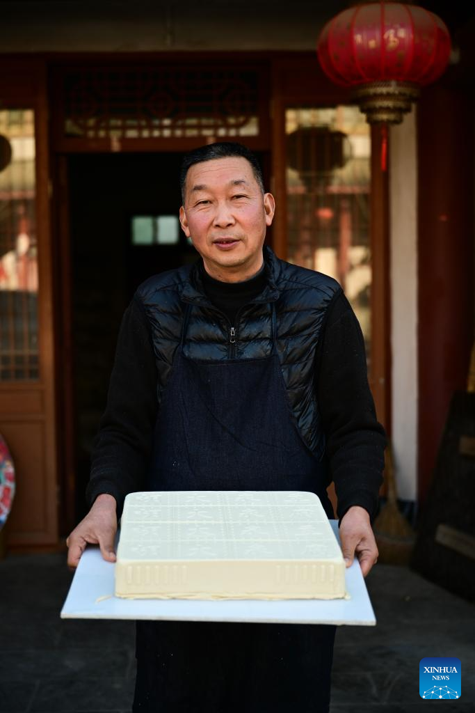 Hu Xuebing, a provincial intangible cultural heritage representative inheritor of the traditional tofu making skills, shows the prepared tofu at Daquan Village of Bagongshan Township in Shouxian County, Huainan City, east China's Anhui Province, Jan. 15, 2025. (Xinhua/Zhou Mu)